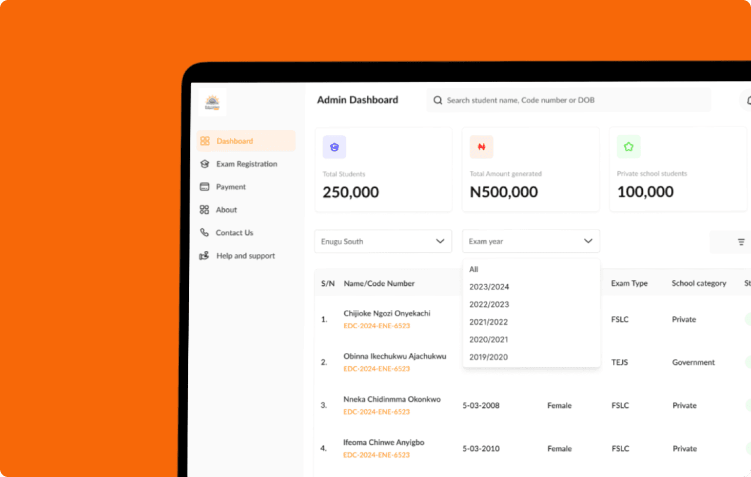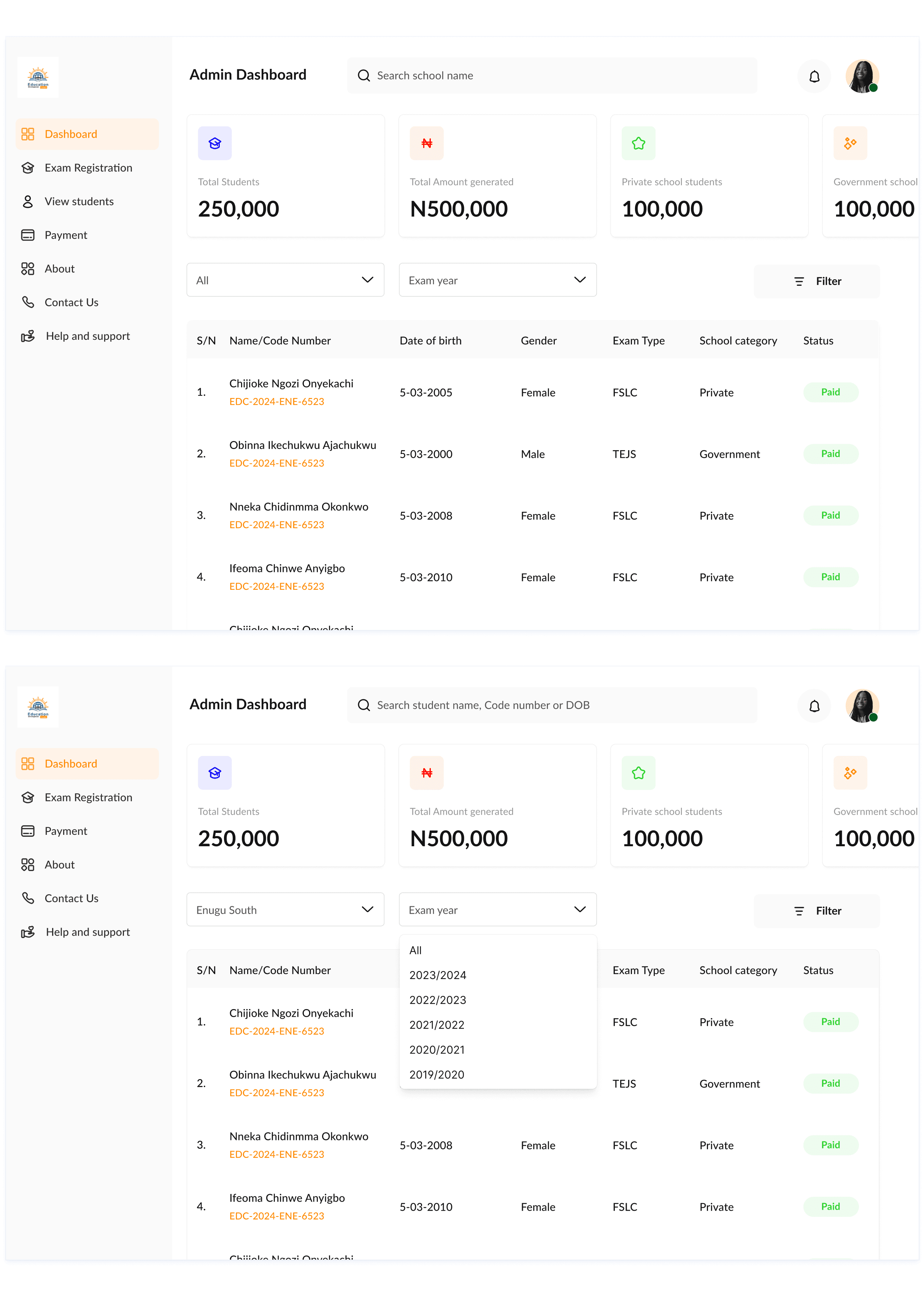 The admin dashboard allows the administration to see the total number of students that have registered for the examination, the total amount of money generated in that session registration, the number of private students and the number of primary school that registered. The dashboard consist of the students name, the students registration number, the date of birth, the gender of the students, the exam type , the school category and also the status of the payment