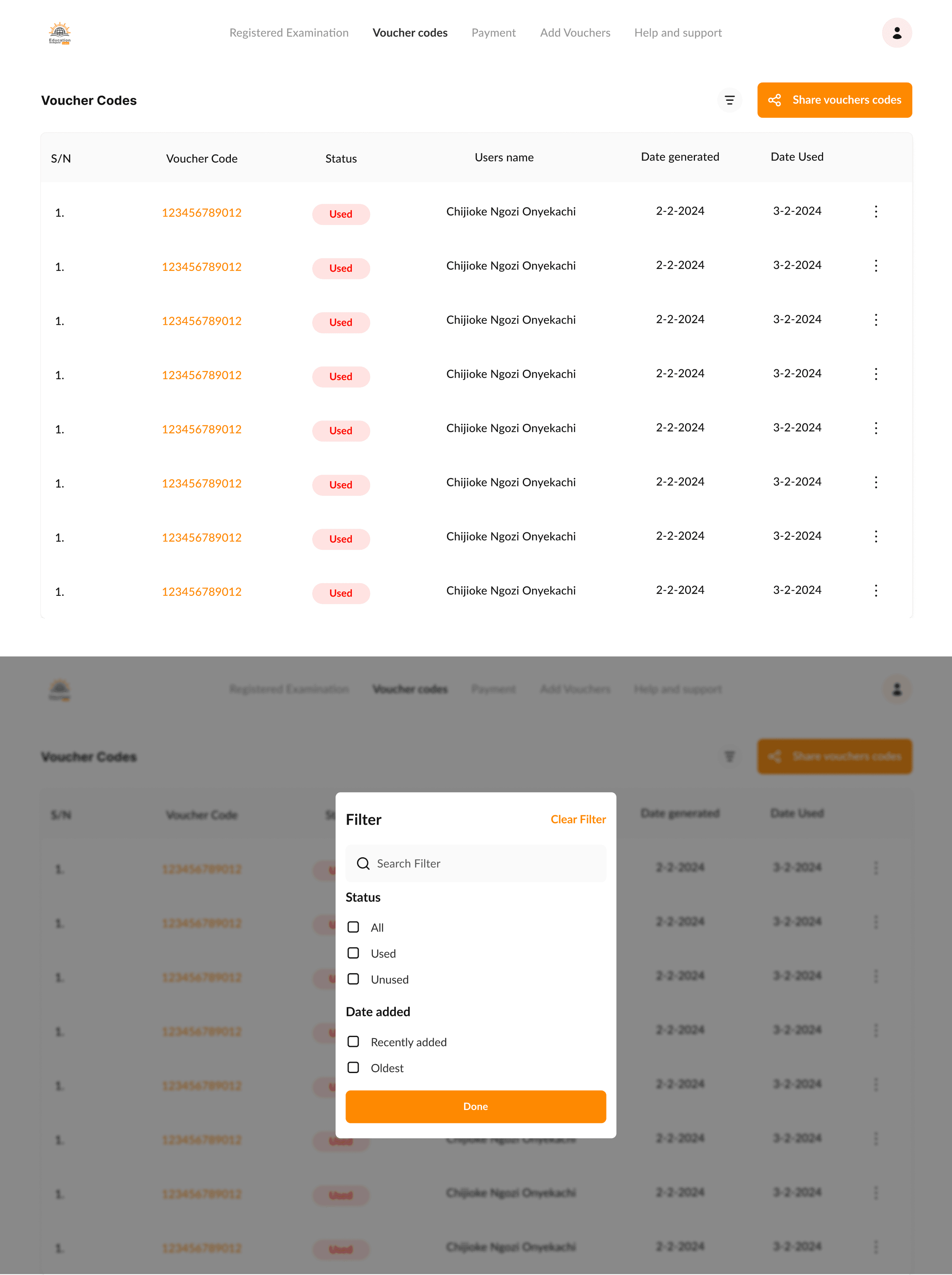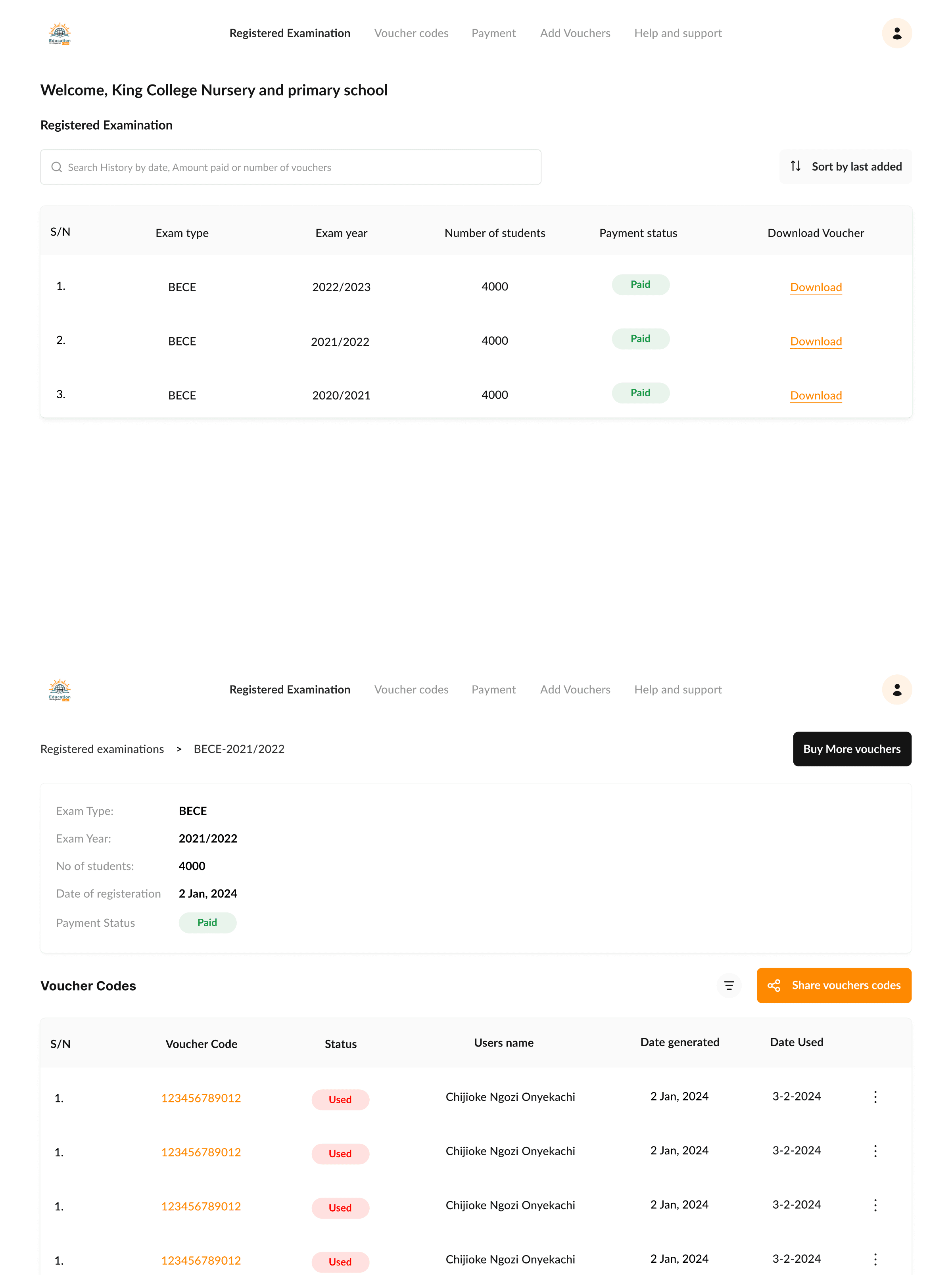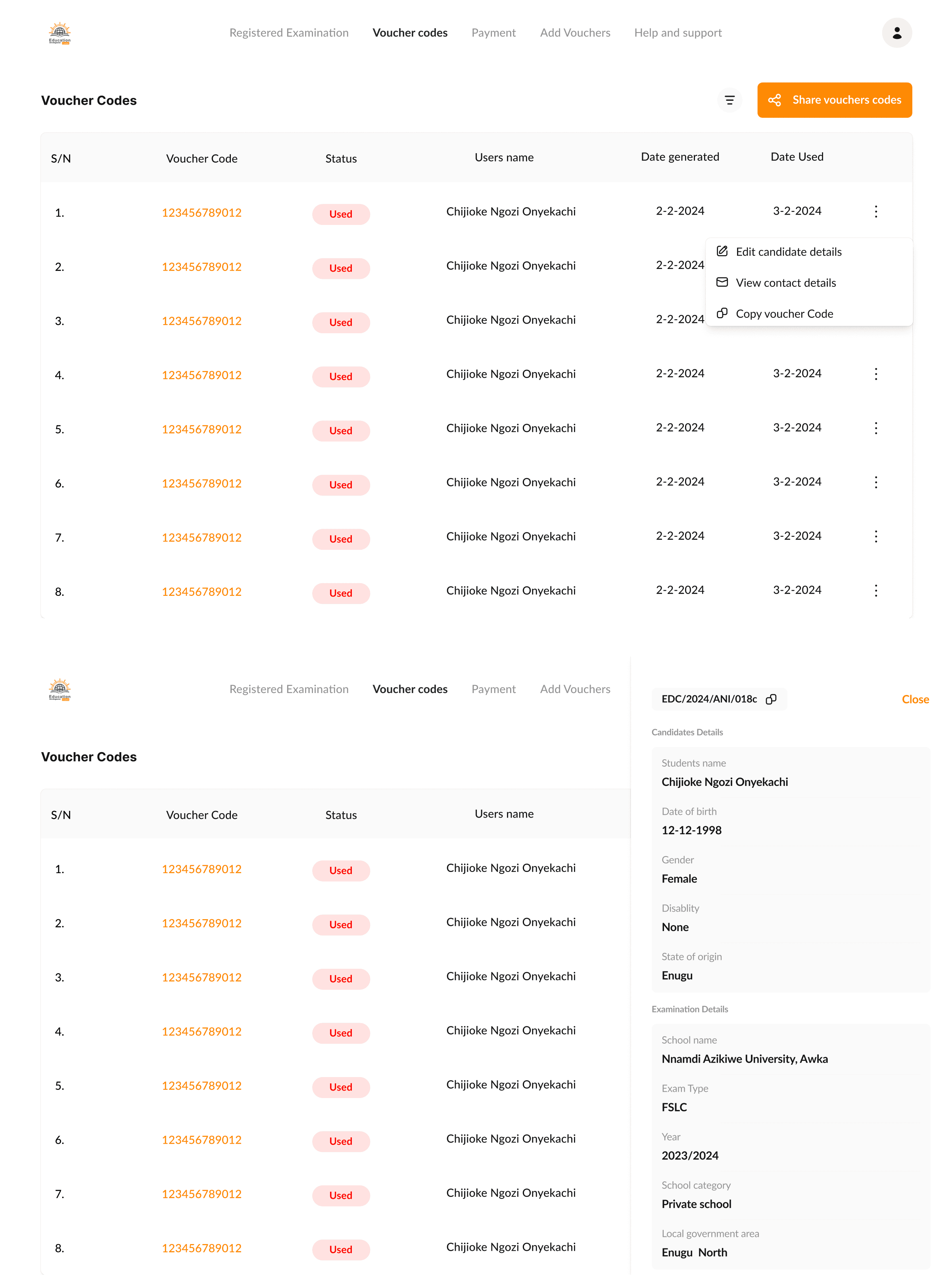 Here, the school can see all the voucher codes, if it was used and who used it, and also see the date it was generated and the date it was used as well. They can also share and download the voucher code as a PDF