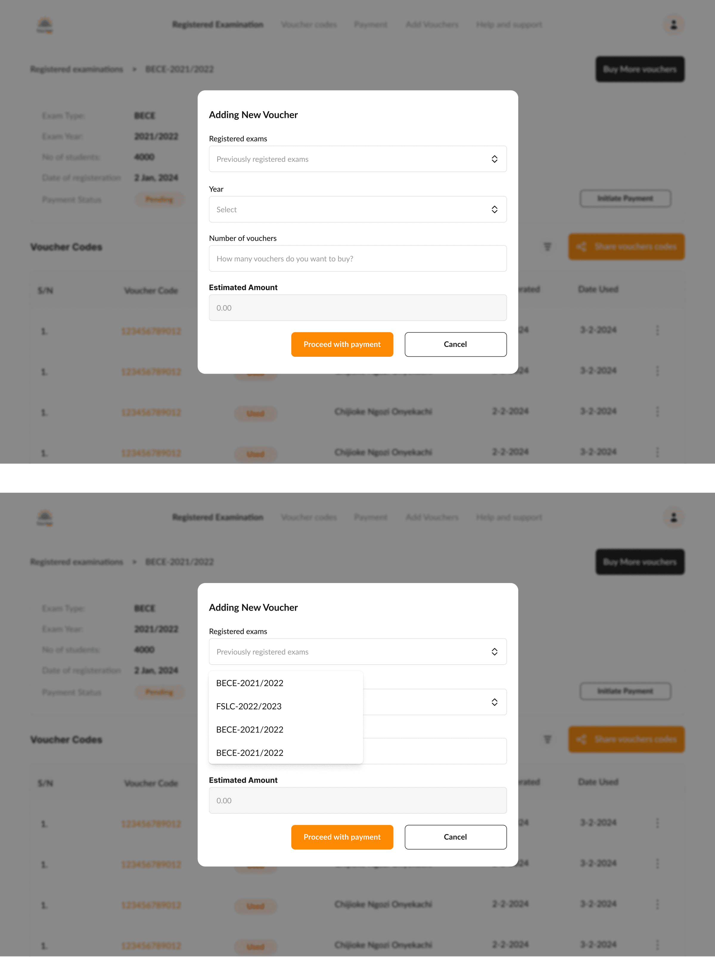 Adding new or more vouchers to an already registered examination, The admin choses it it a new voucher or an existing registered examination, the year, number of vouchers, and the computer generates the estimated amount the school will pay and then the user proceeds to make payment