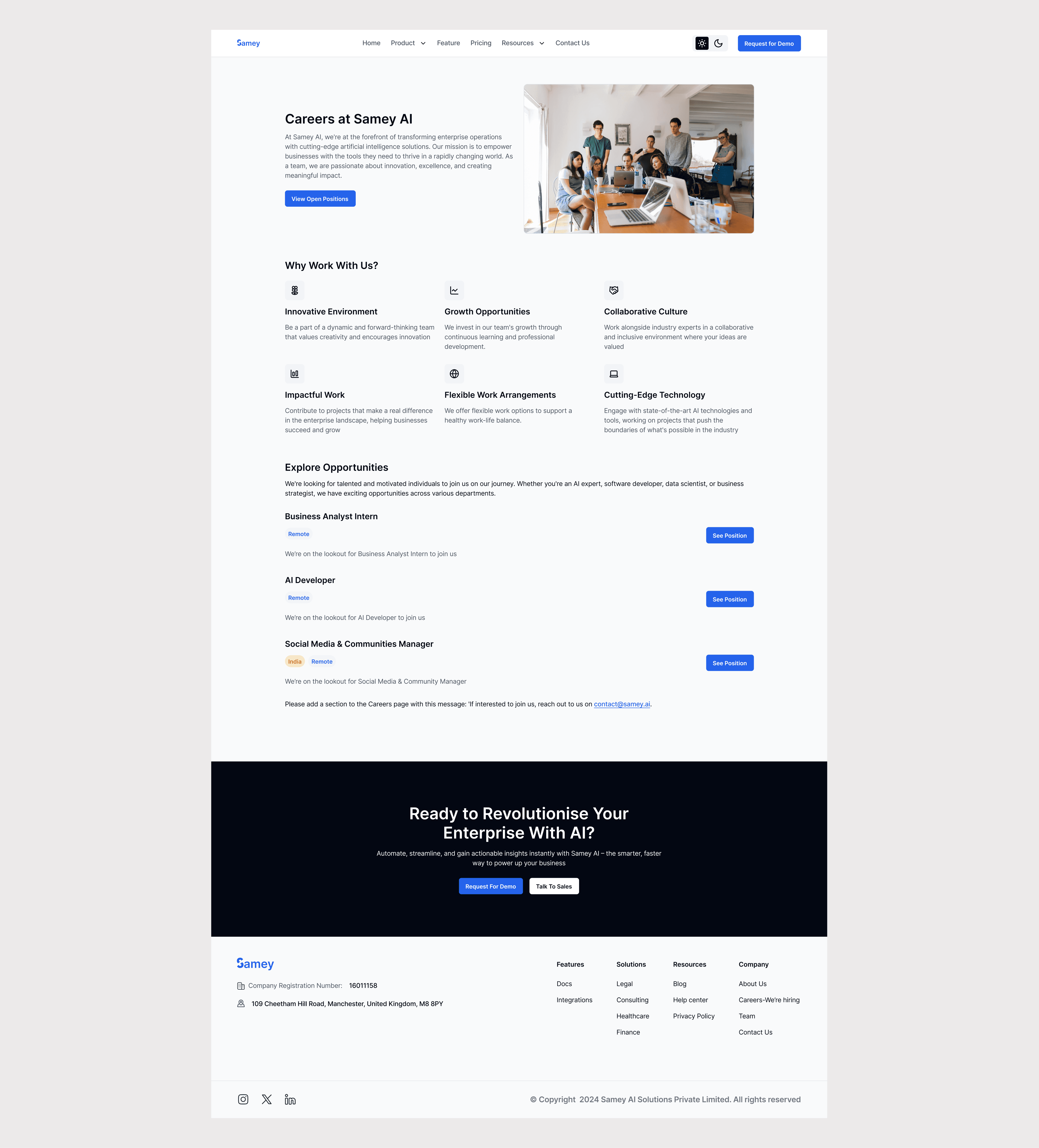 The updated career page does not have many changes to it. This shows a briefing about the careers in Samey AI and how Samey Ai values its employees. Followed by reasons to work with us and then the opening available in Samey AI.