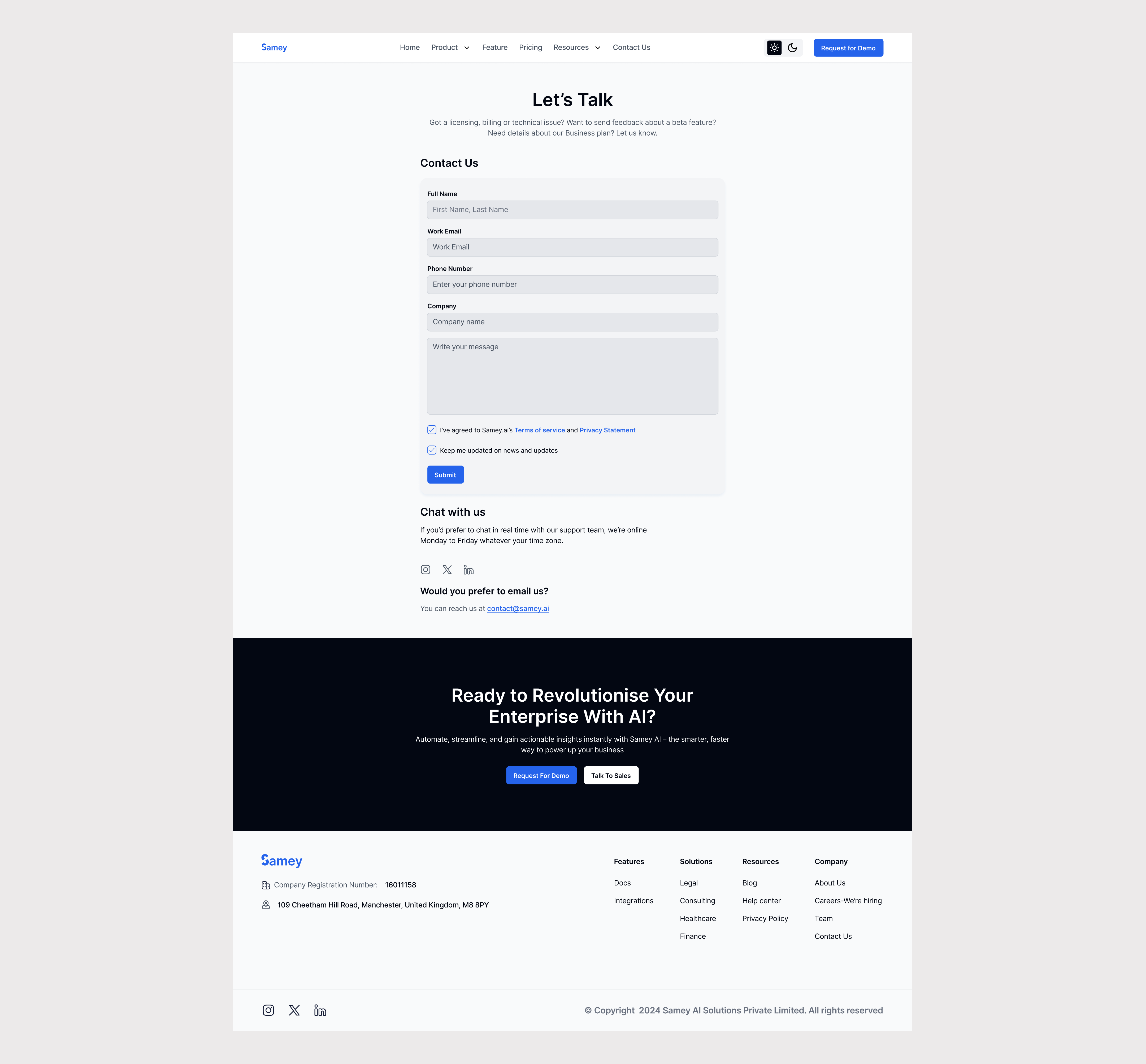 The contact us page has exactly what i had in mind, a design with minimal information to focus the user's attention to just filling the form, requiring vital information like full name, work email address, phone number and company and the message the user would like to share with Samey Ai. And finally, the socials for easy communication.