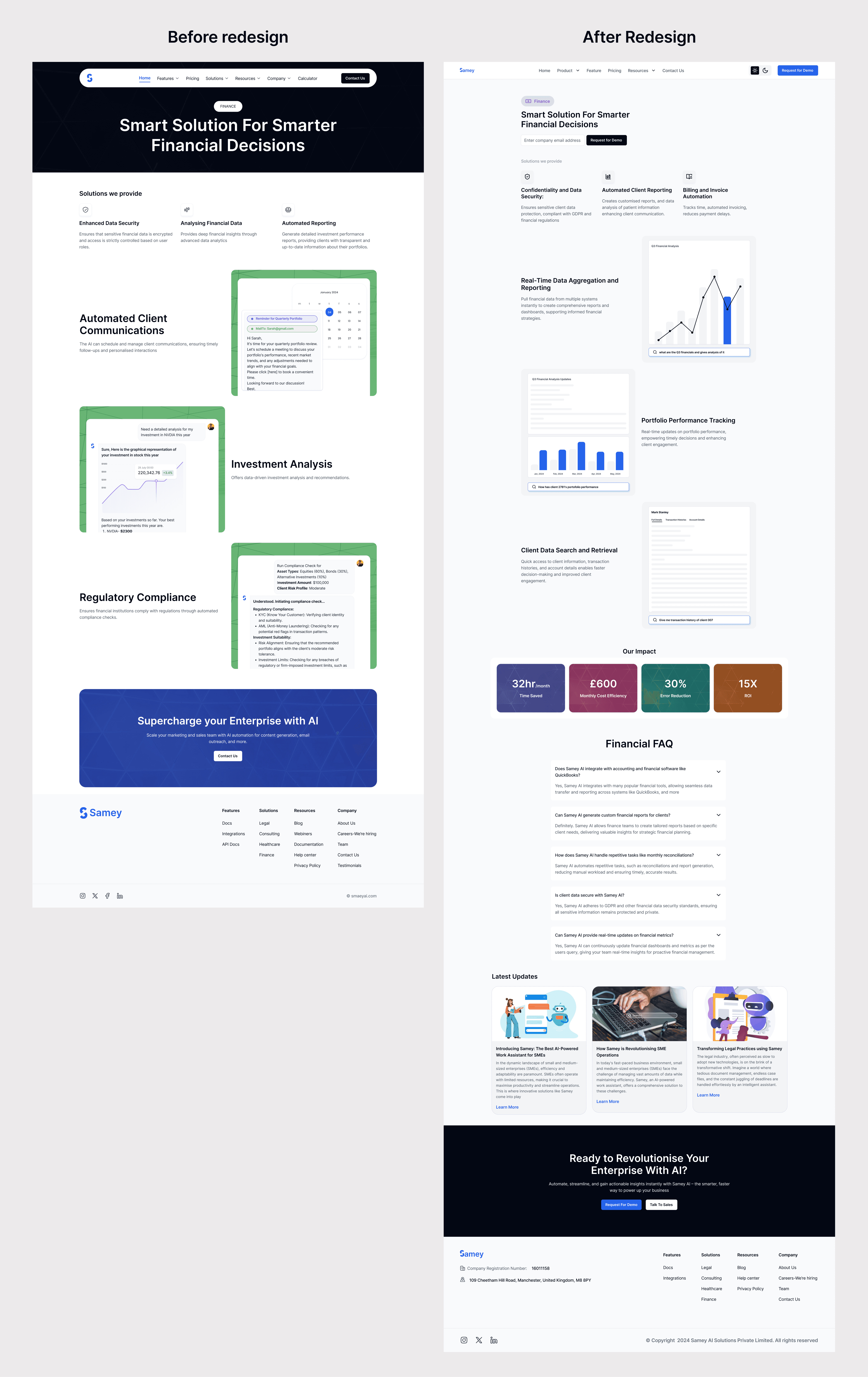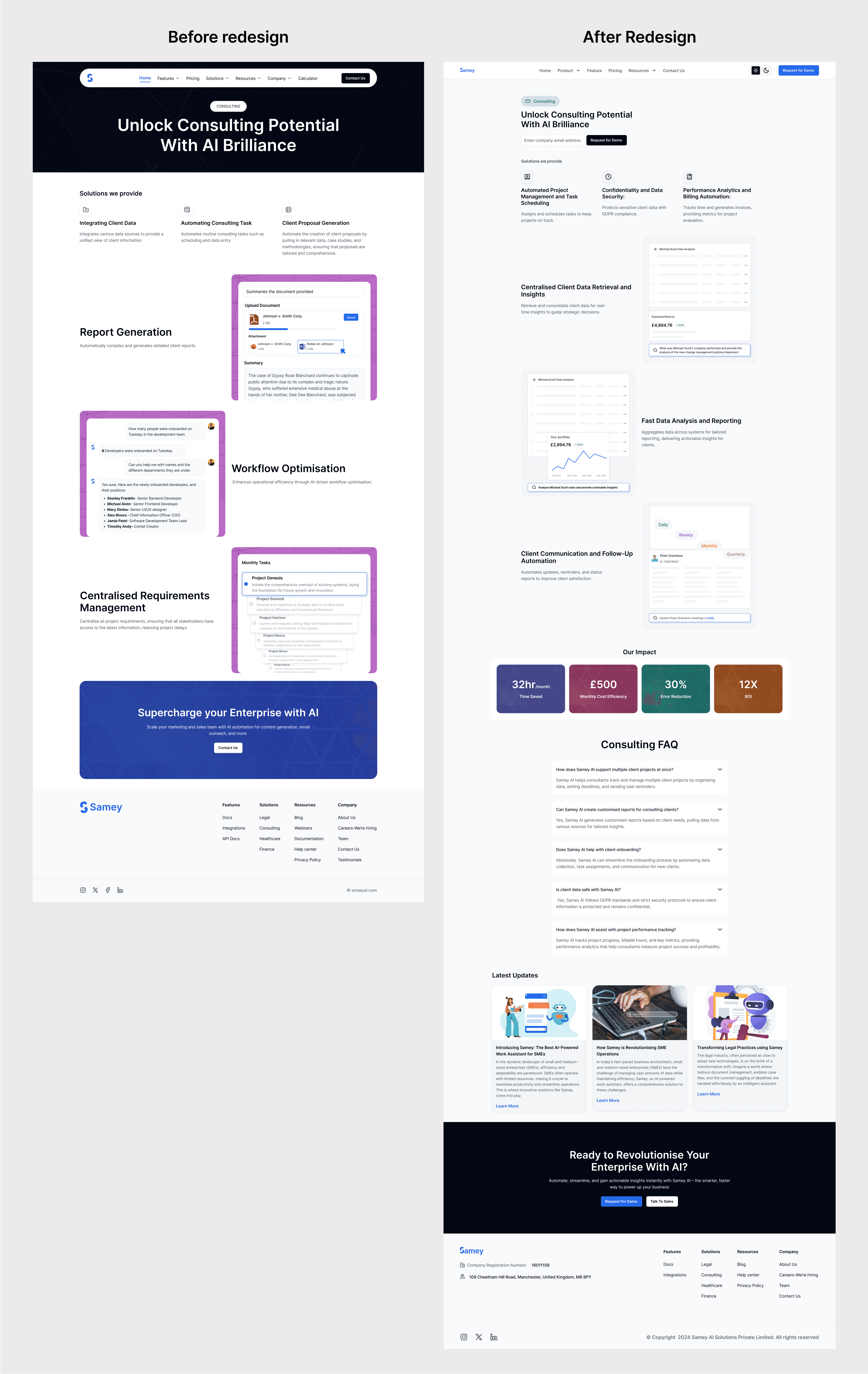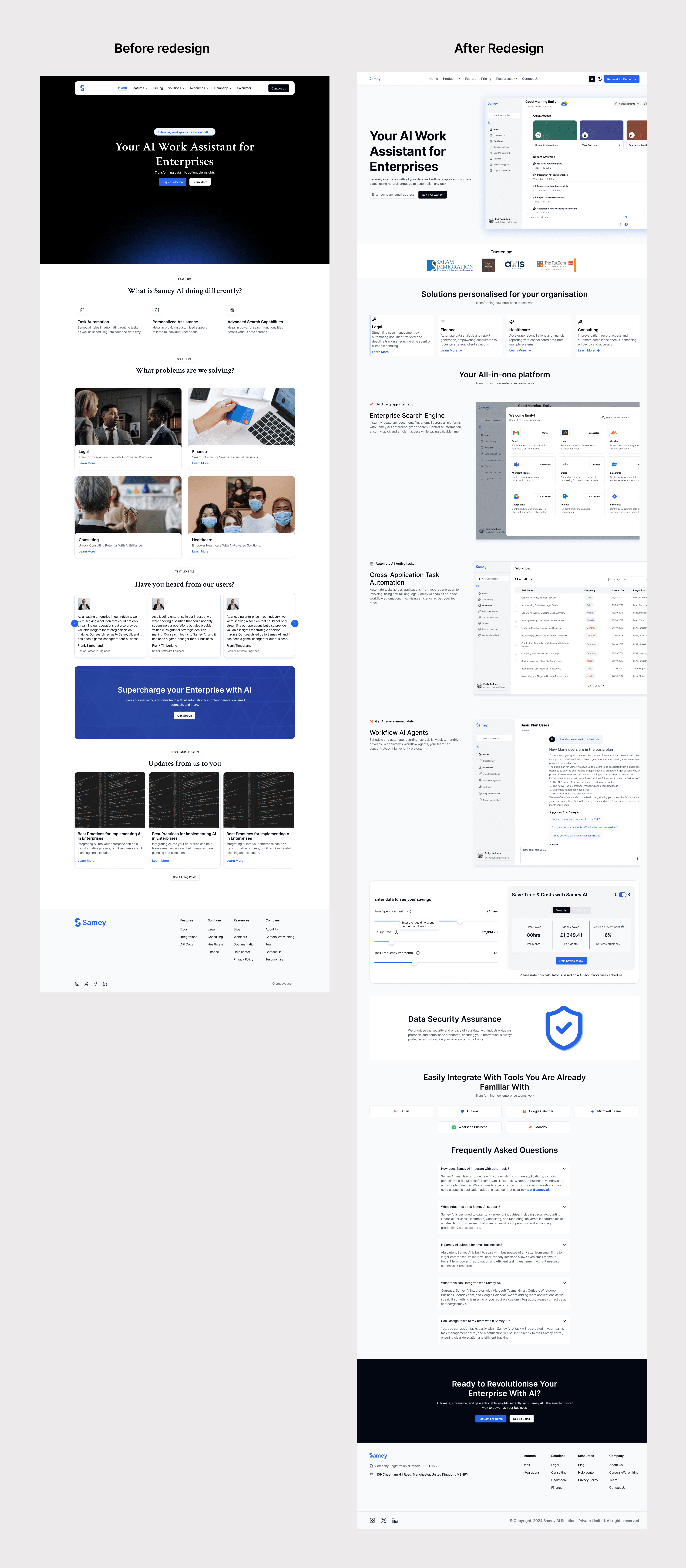 The redesigning of the website opened my eyes to a lot of design choices that will effectively help the users while navigating the website. The new website is not only aesthetically pleasing but filled with a lot of content. For this new website, users won't have to scroll through a lot of things to understand what Samey AI does and offers.