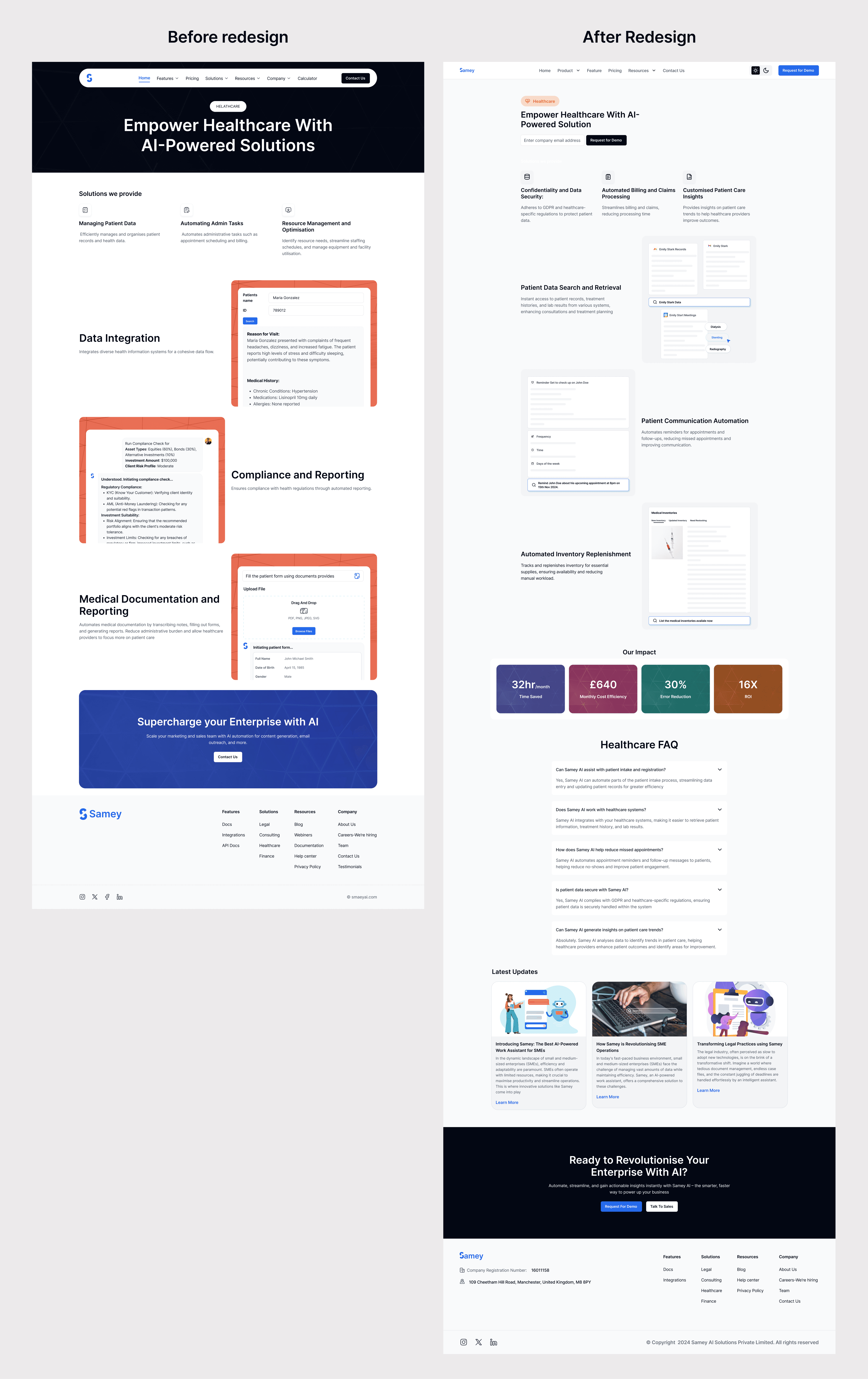 The v.1.1.0 home page did not capture the essence and full details of the Samey Ai product. There was also a lack of visuals and content in the v.1.1.0. Some and most of the information on this version are also not valid, information like the testimonials and problems information on this version are also not valid, information like the testimonials and problems Samey AI is solving.
