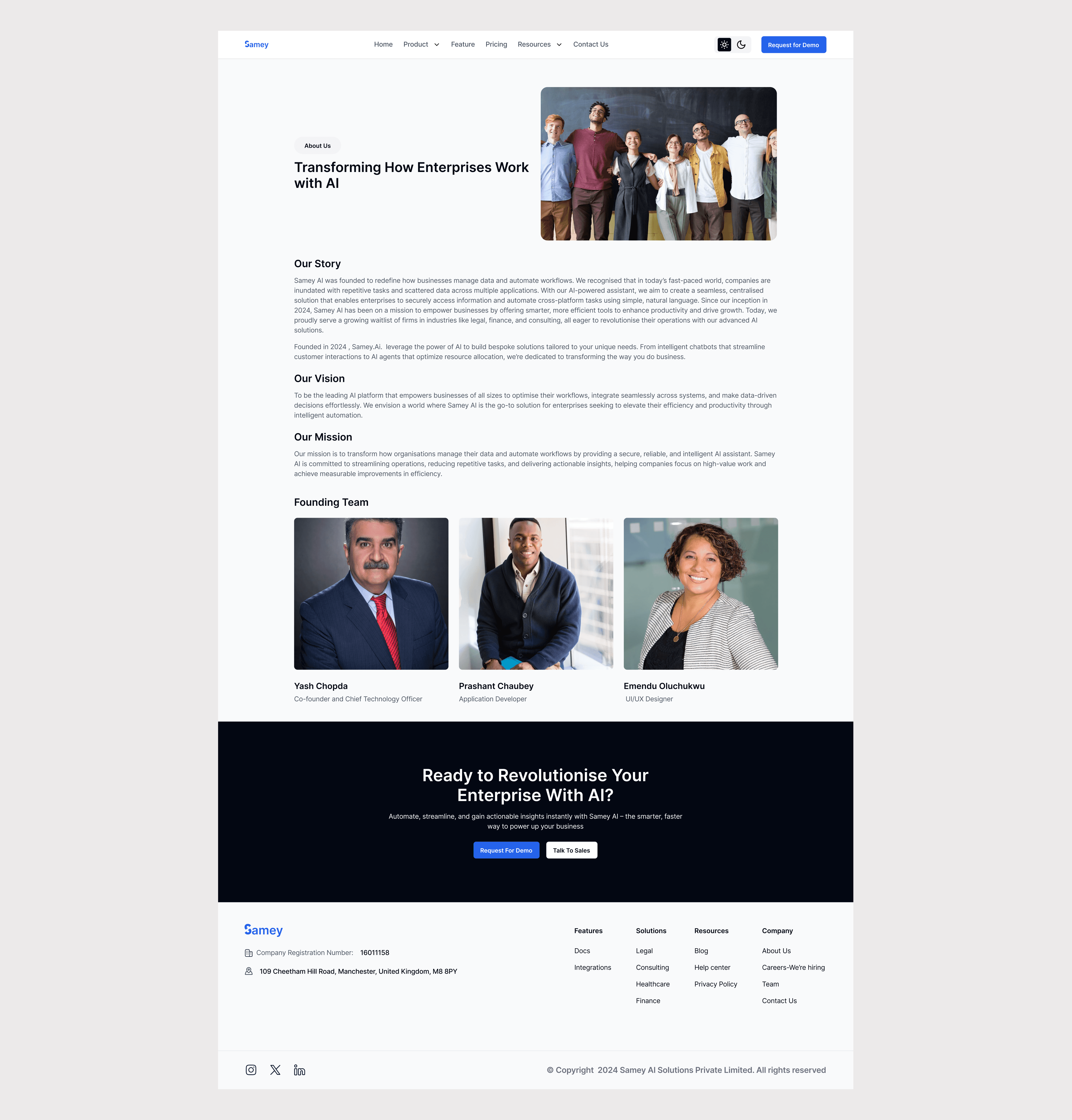 The about us page highlights the brief about and details of Samey AI. Showing our story, our vision and our mission as a team. It also includes the founding team.