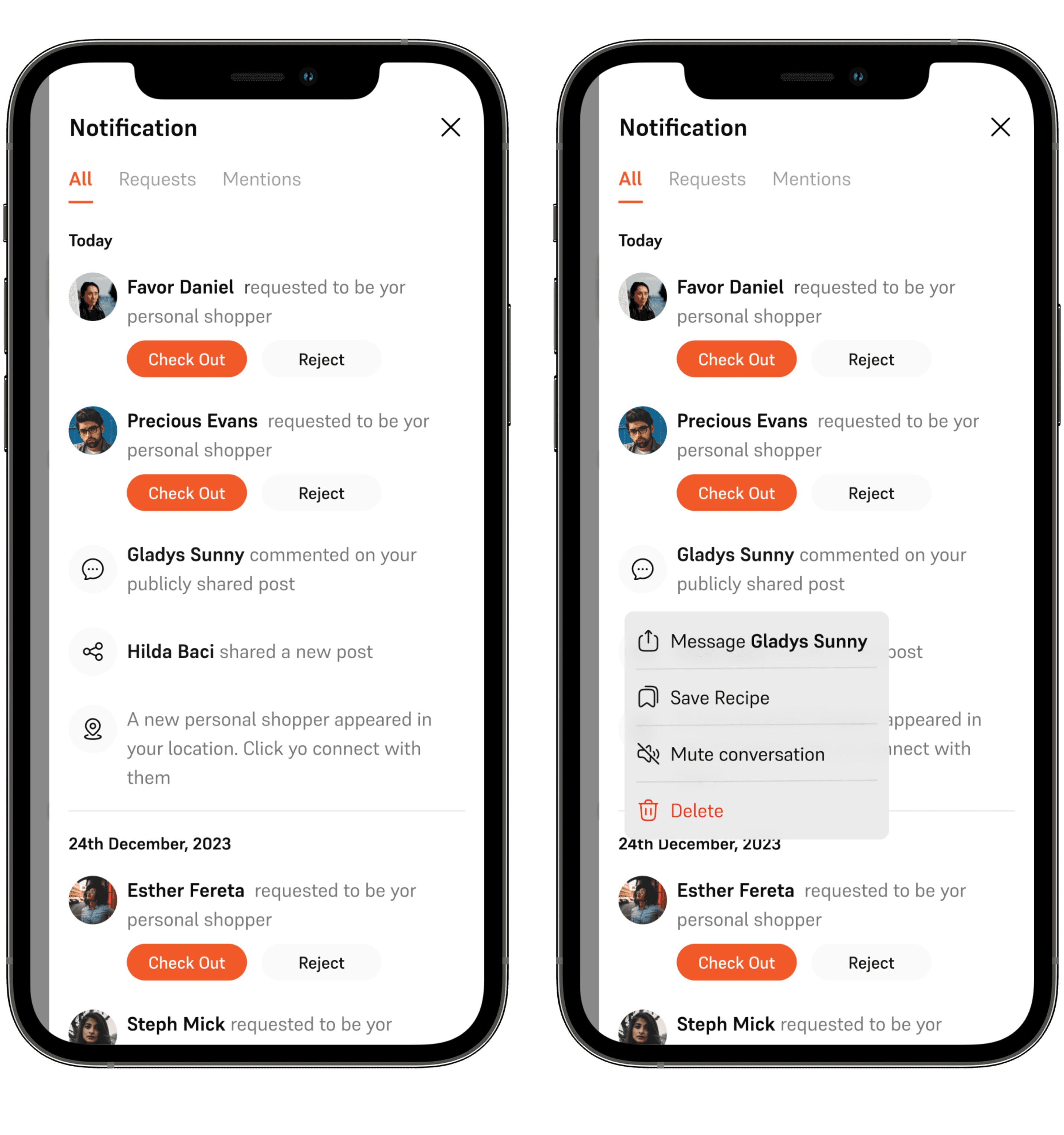 Shoppers get notified when their is a price increment or decrement. They also get notified when when they are mentioned in comment or when their favorite influencer makes a post. They also get notified when a new personal shopper appears in their area.