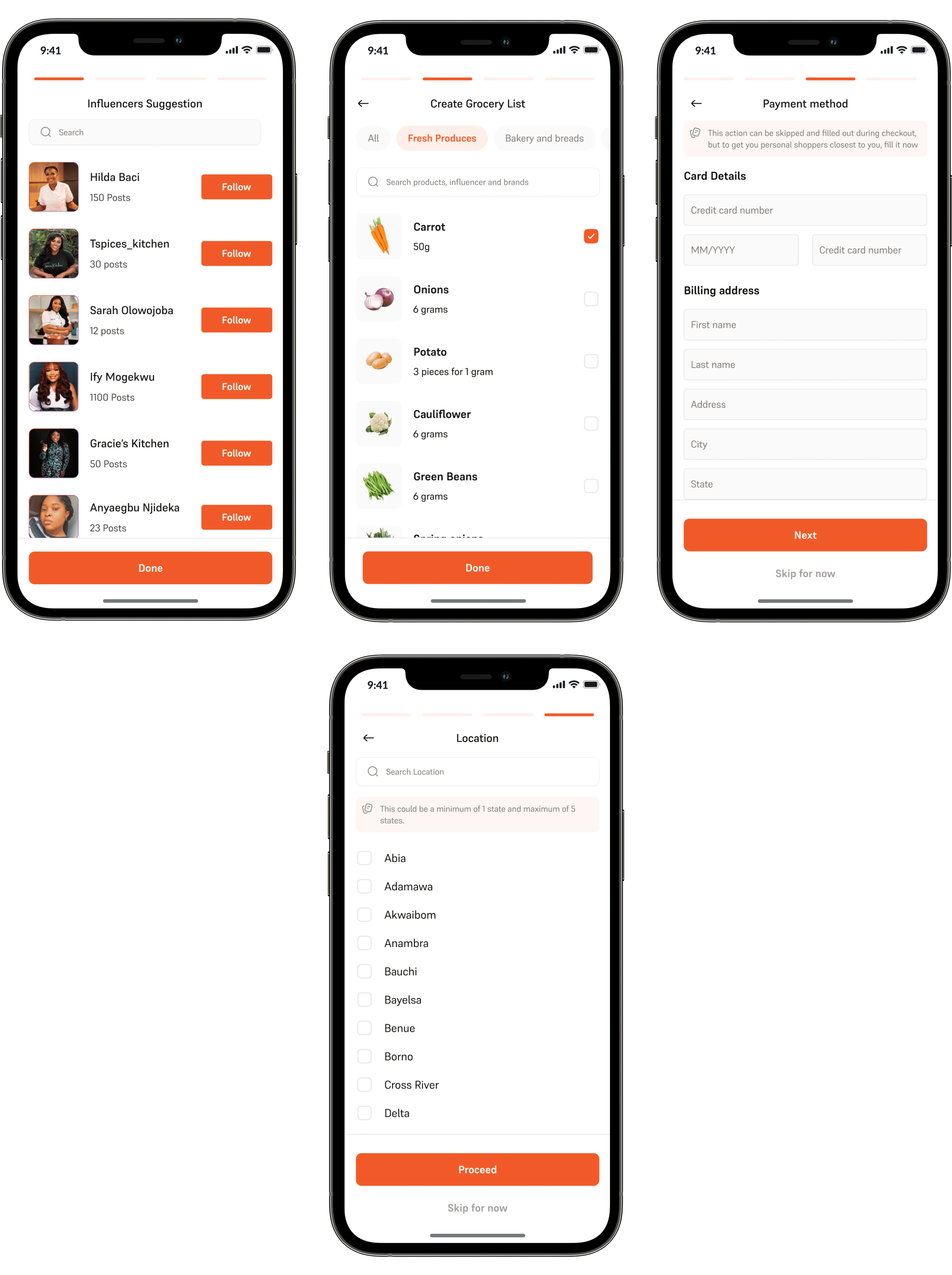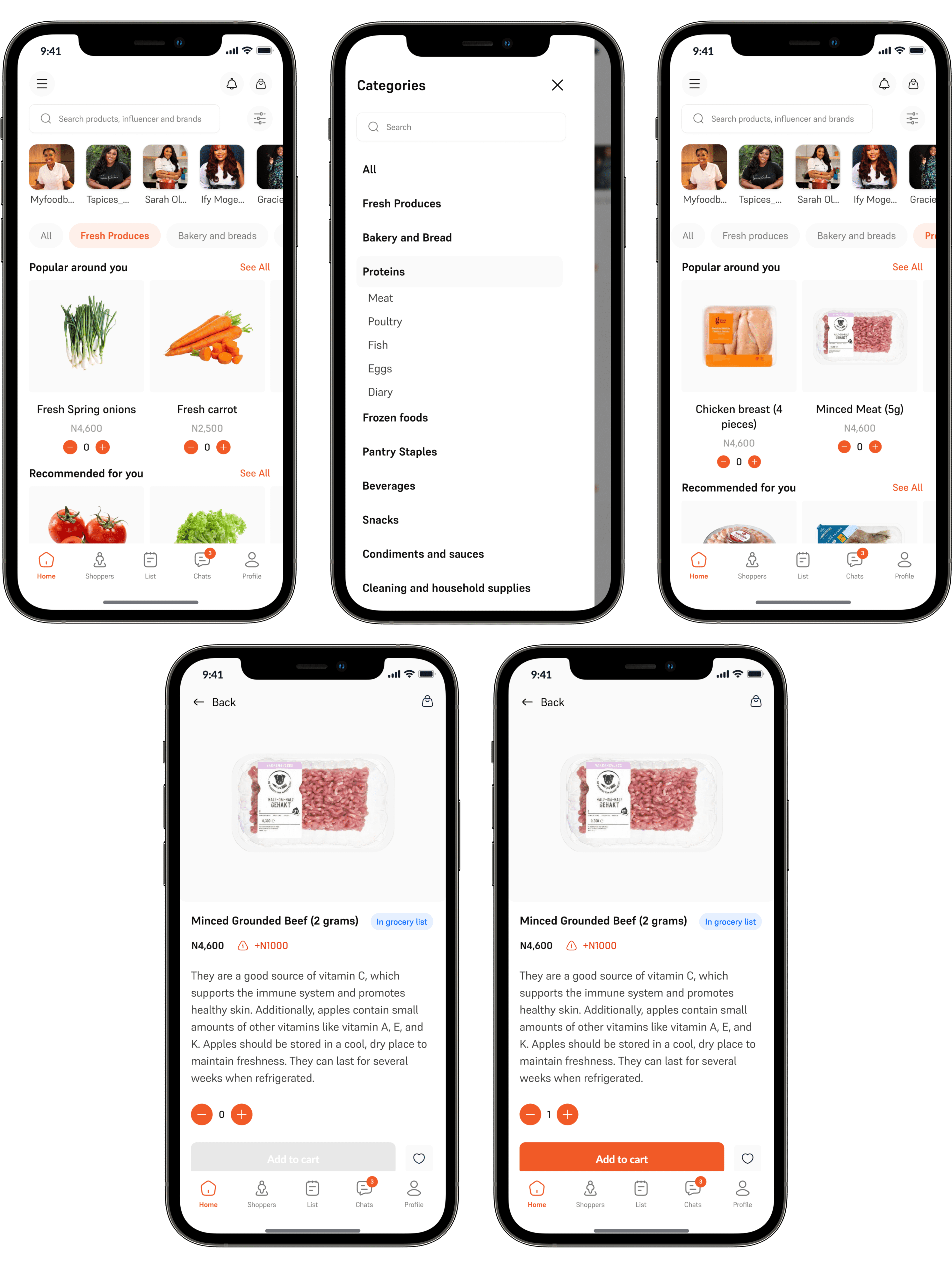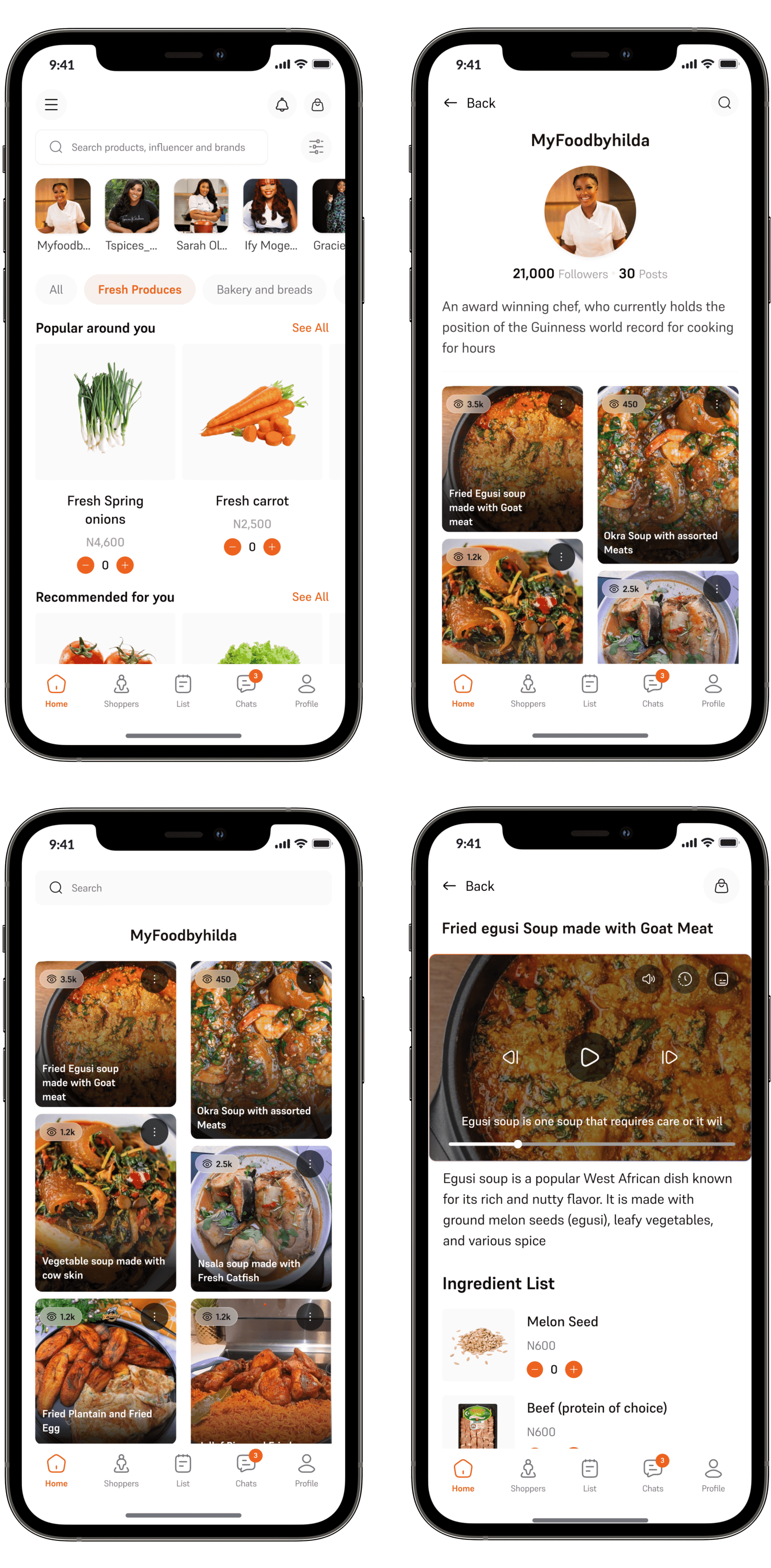 First of all, i don’t know why i called it that, but what this does is, all the influencer that a shopper is following, appears on the top corner of the home page, when the user clicks on a any of the influencer, the influencers details comes out, as well as the foods they've posted ion the app. Each recipes consists of the food list used un making the food as well as their various prices.