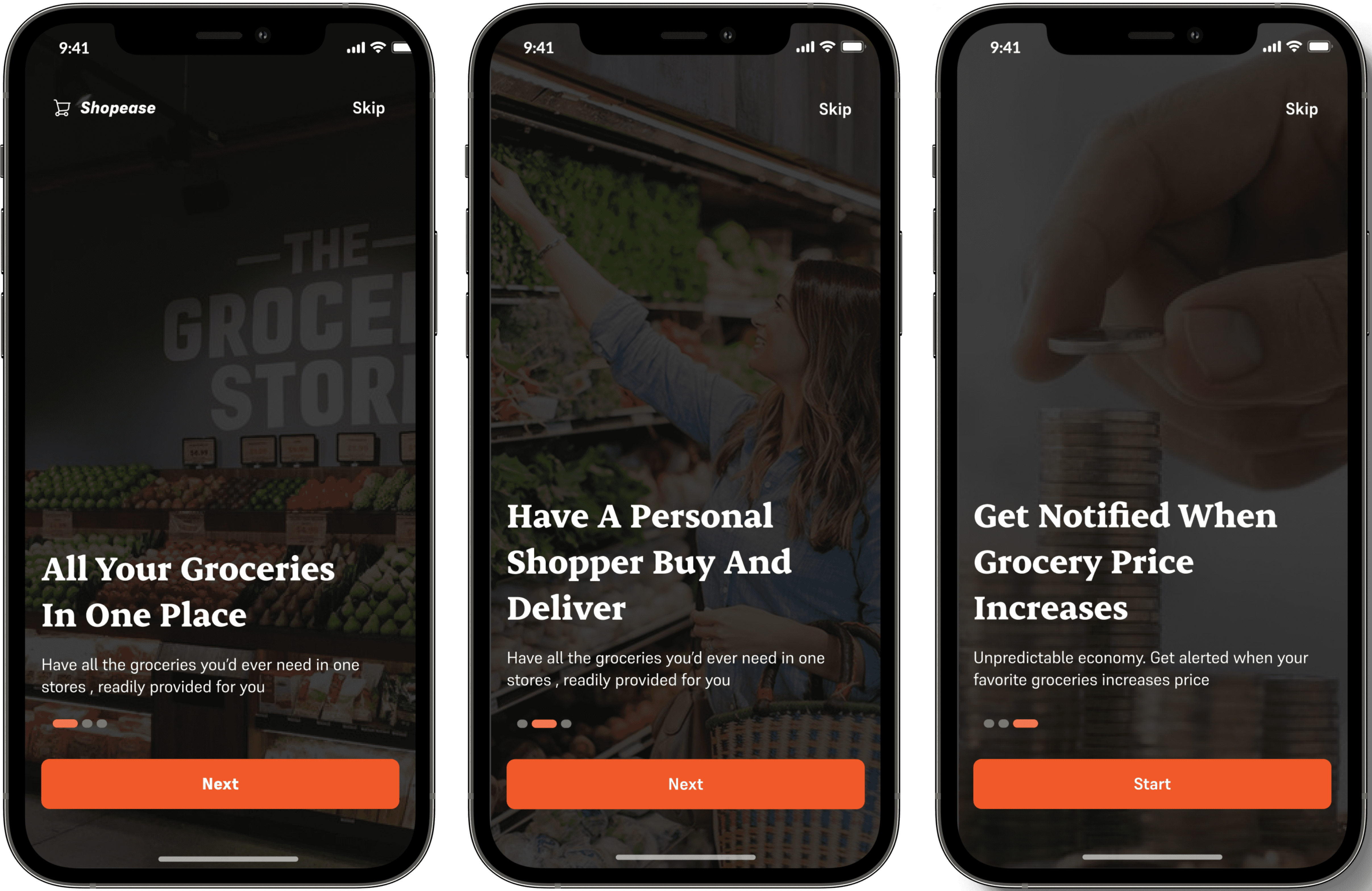 The onboarding screens a quite simple and straight to the point, strictly narrating the things that the users will get to benefit from using Shopease, while also giving them option to skip all these processes and go straight to the next process.