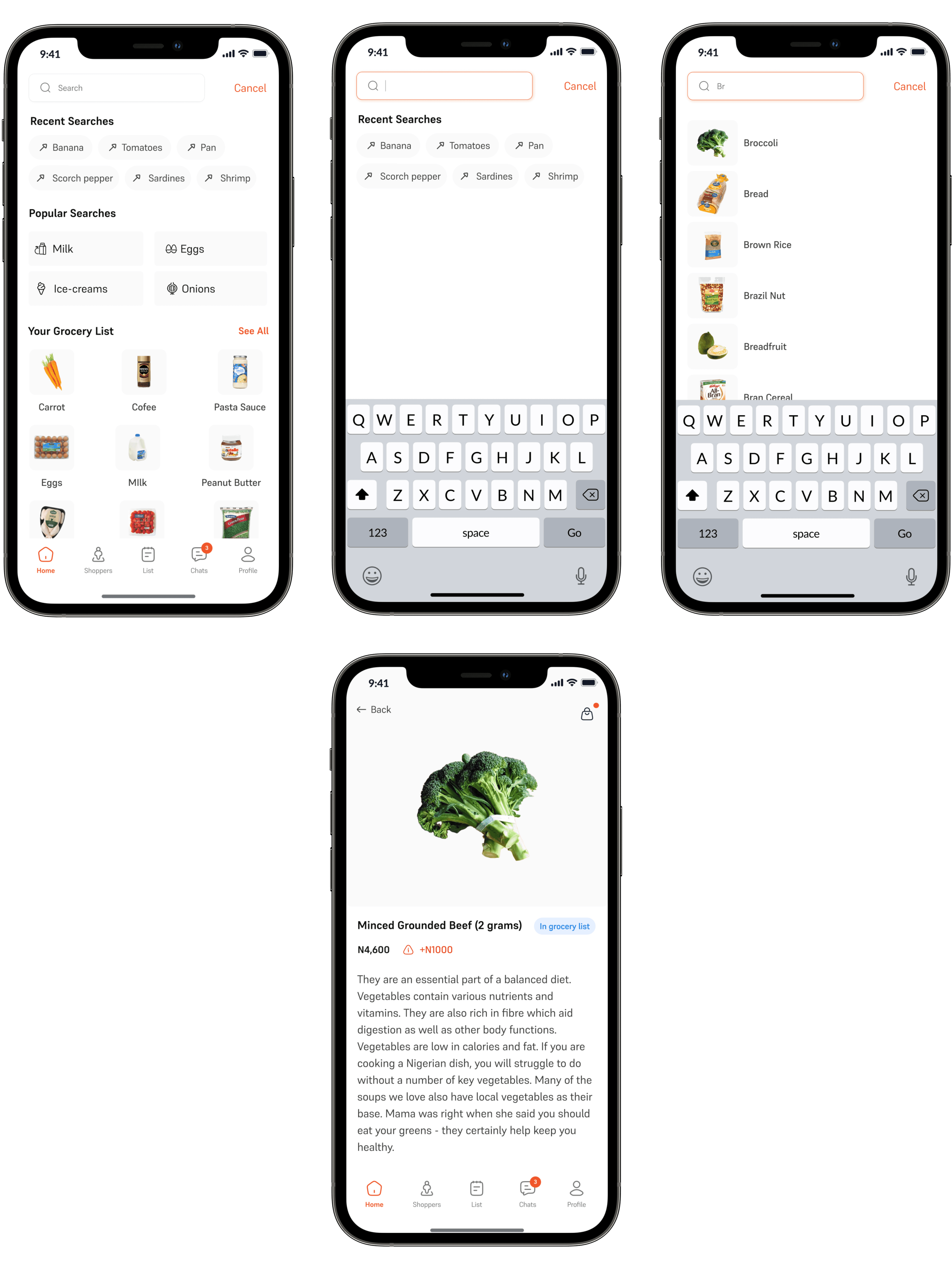 Shoppers can search for products that they want to get and also get possible recommendation, all these while showing them what is in their grocery list. The search result is just the product description of that product and an add to cart button.