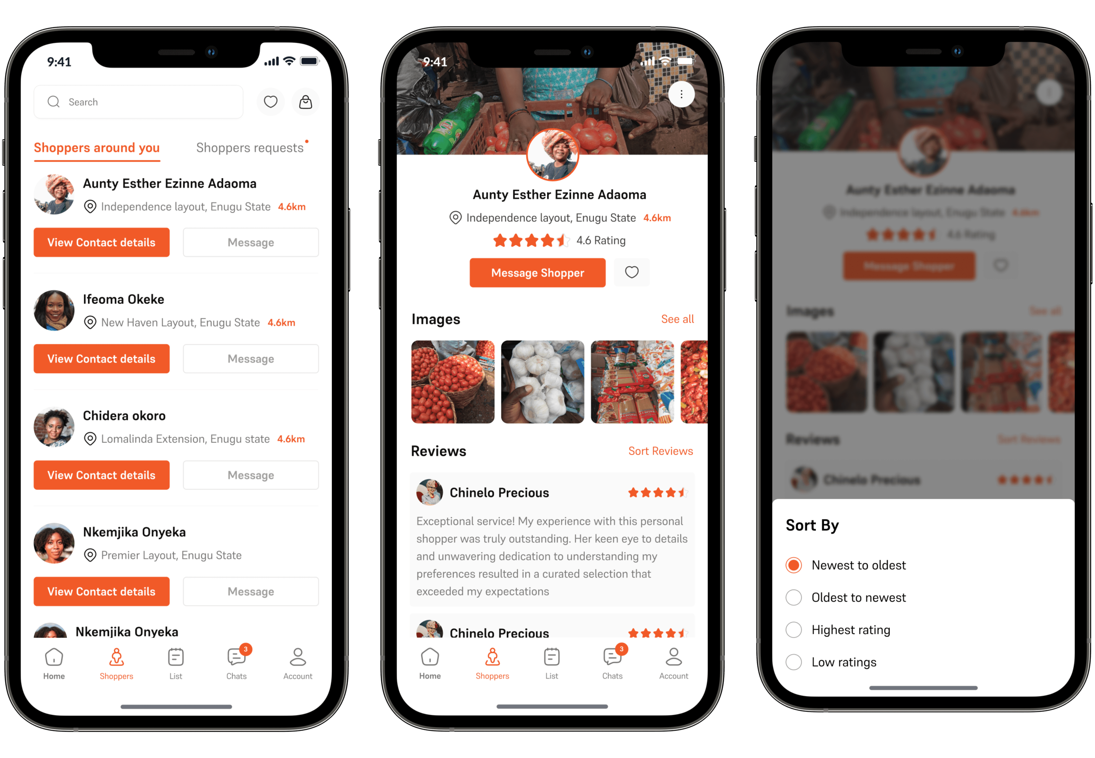 This shows the shoppers a round the users and how far away they are from the. The users can choose to message shopper or view contact details. The contact detail include the shoppers full name, location and rating. It also include any added image to improve trust as well as testimonials from previous client.